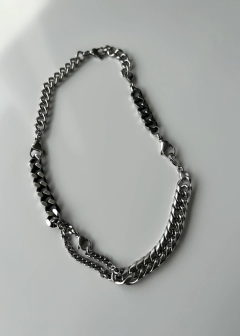 100% acero quirúrgico. Cadena que la podes armar como más te guste ya que tiene muchos mosquetones para achicar tramos, usarla de pulsera, de choker o como más te guste.